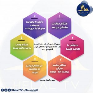 عن علی (رضی الله عنه) قال: قال رسول الله(صلى الله علیه وسلم): للمسلم على المسلم ست بالمعروف یسلم علیه إذا لقیه و یجیبه إذا دعاه و یشمته إذا عطس و یعوده إذا مرض و یتبع جنازته إذا مات و یحب له ما یحب لنفسه . حضرت على ( کرم الله وجهه ) میفرماید که رسول الله (صلى الله علیه وسلم) فرمود: یک مسلمان بالای مسلمان دیگر شش حق دارد، هنگام ملاقات سلامش میدهد ، دعوتش را اجابت میکند ، هنگام عطسه برایش (یرحمک الله) میگوید ، در مریضی به عیادتش…